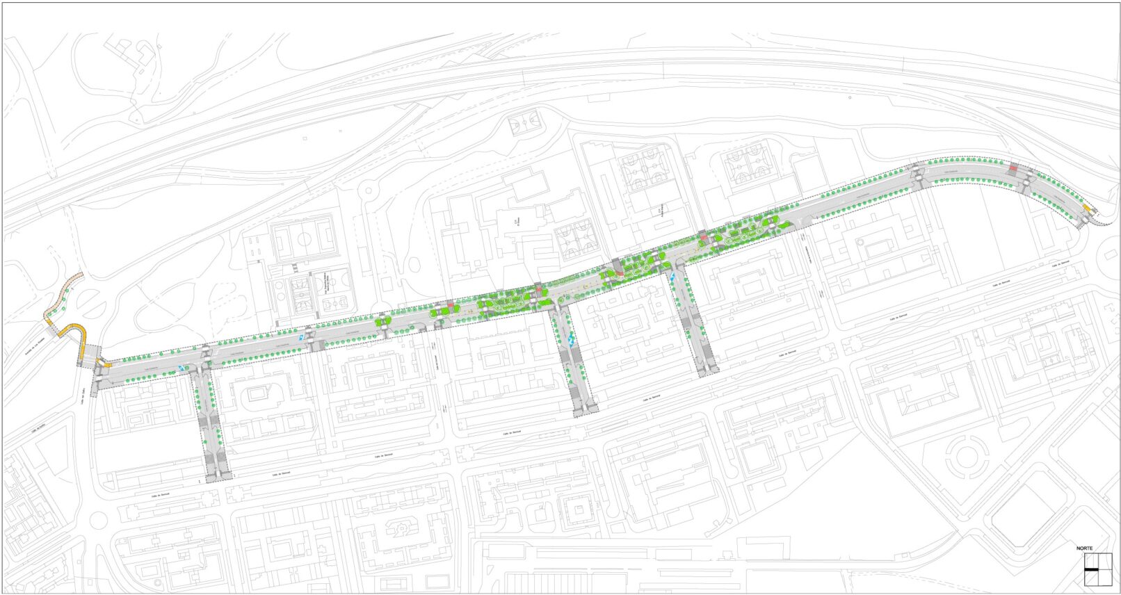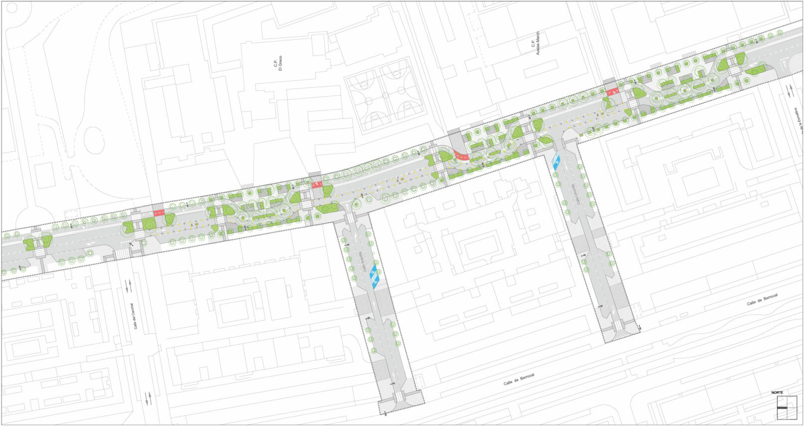 Estas acciones concretan las estrategias de diseño de reequilibrio del espacio público, cambio en la jerarquía de movilidad y renaturalización de la ciudad en el entorno concreto de varios centros escolares situados en una vía secundaria, pero de gran sección, en un barrio de la periferia urbana.