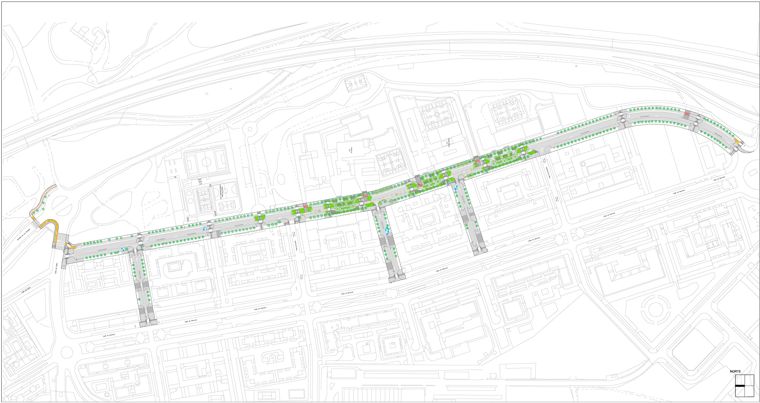Para alcanzar los objetivos del proyecto se desarrollan tres tácticas: mejora de la habitabilidad para la estancia junto a las puertas de los centros, aumentado la superficie peatonal y la permeabilidad del suelo en estas zonas además de incorporando vegetación de porte diverso; calmado de tráfico, ajustando el ancho de la calzada para un solo sentido de circulación e incorporando pasos peatonales elevados y quiebros en la directriz de la calzada-; y conexión ciclista, integrando un carril bici bidireccional que recorre toda la calle y conecta con el Parque Lineal del Manzanares.