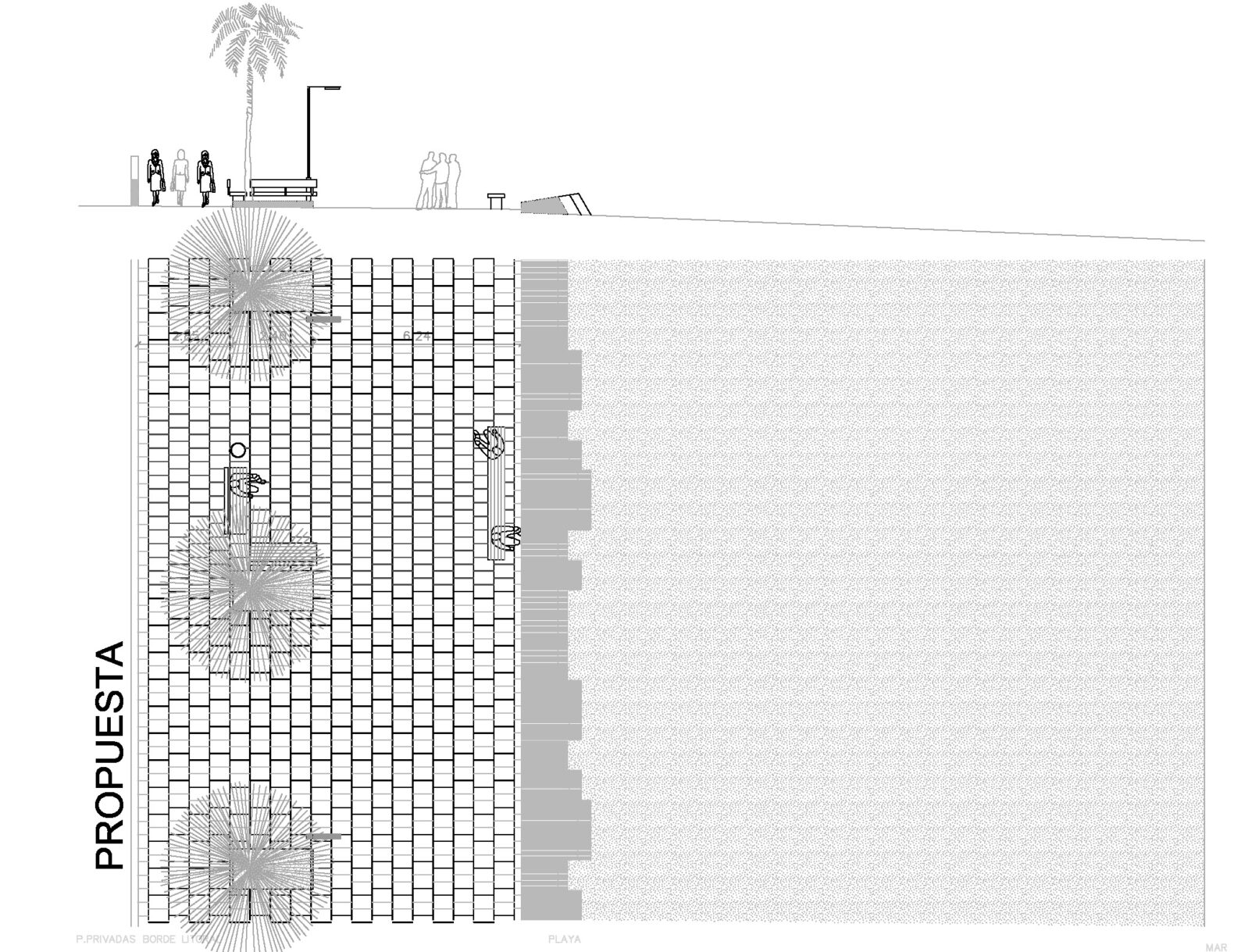 Debido a estos límites son claramente necesarios, puesto que su dinámica es acreciente, hemos propuesto un diseño que consigue un encuentro más natural, una línea fractal no uniforme ya que la arena en sus movimientos ira llenando las piezas más pequeñas. Se producirá una traslación de la línea que genera el mar, la espuma, en contacto con la arena. Es decir proponemos un elemento límite que conjugue un encuentro natural con la arena y limpio y claro con el paseo.