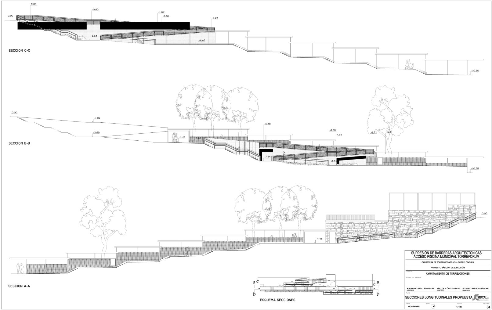 Se trata de realizar el acceso a personas con movilidad reducida a las piscinas municipales del Club de Campo de Torrelodones. El desnivel a salvar entre el acceso y la piscina es de 8.74 m, que se realiza en dos tramos el primero desde el acceso general hasta los vestuarios y taquilla con un desnivel de 4.48m y un segundo tramo de 4.26 m desde estos, a el vaso de la piscina.